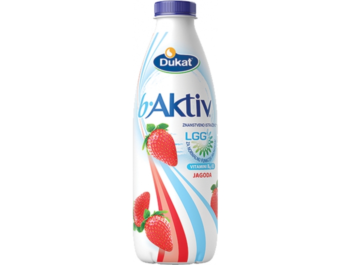 Pasterizované částečně odtučněné MLÉKO s 1,5 % mléčného tuku, jahodový přípravek 10 % (jahodové pyré (z koncentrátu) 34 %, cukr, glukózo-fruktózový sirup, modifikovaný škrob, aromata, barvivo: karmín; zahušťovadlo: pektin; regulátor kyselosti: kyselina citrónová) , cukr, vitamíny: E, B6; jogurtová kultura, kultura Lactobacillus rhamnosus (LGG®).
