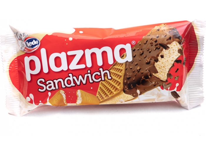 Jedinečná vrstva zmrzliny s příchutí Plasma mezi dvěma měkkými sušenkami je obohacena mletou plazmou a pokrytá jemnou mléčnou čokoládou posypanou velkými kousky mleté ​​Plazmy.