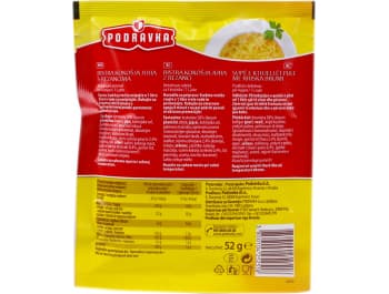 těstoviny 58 % (tvrdá PŠENIČNÁ krupice, VEJCE), jedlá sůl, palmový olej, zvýrazňovače chuti (glutaman sodný, inosinát disodný), kukuřičný škrob, maltodextrin, cukr, sušená zelenina 2,4 % (mrkev, cibule, celer), koření, kuřecí tuk , sušený kuřecí extrakt 0,4%, petrželová nať, aroma, barvivo (obyčejný karamel).