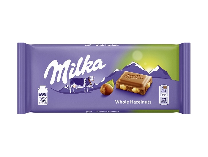 Alpenmilchschokolade mit ganzen Haselnüssen.