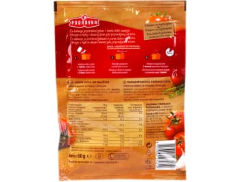 Getrocknete Tomaten 35 %, Maisstärke, Zucker, Weizenmehl, Speisesalz, Palmöl, Hefeextrakt, getrocknetes Gemüse 1,1 % (Zwiebel, Sellerie, Knoblauch), schwarzer Pfeffer, Thymian.