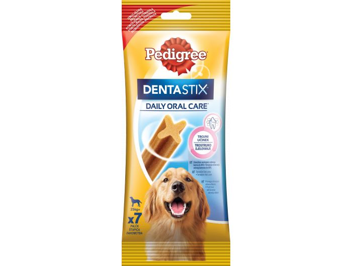 Pedigree Dentastix for large breeds contains 7 pieces of sticks in unique X shapes, which are intended for daily intake. The combination of their special texture and active ingredients has proven to help reduce accumulated stones by up to 80%. They are designed to be chewed long enough to be effective. Pedigree Dentastix for large breeds strengthens teeth and reduces the risk of gum disease and allows dogs to have healthy teeth. Chewing sticks also taste great, without fat, without artificial colors and flavors and without added sugar.