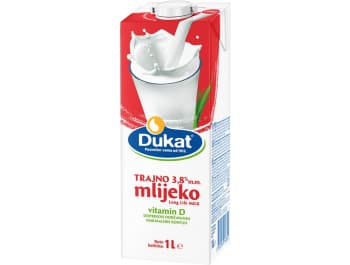 Dukat permanent milk with 3.8% milk fat is characterized by a natural and mild taste and a wealth of preserved nutrients naturally present in milk. The nutritional value of milk is preserved thanks to the most modern technology for milk processing, and the label Mlijeko hrvatski farmi, which Dukat milijeko proudly carries, is a guarantee of the domestic origin of the milk and of the highest quality. Dukat permanent milk with 3.8% milk fat is enriched with vitamin D, which contributes to the maintenance of bone health and strength, while recent research points to the much more widespread importance of vitamin D for the health of people of all age groups.