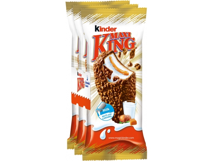 Waffle product, topped with milk chocolate and hazelnut pieces, with milk and caramel filling (56%). Kinder Maxi King is a fresh dessert with an intense taste! Thanks to the unique combination of caramel in the milk filling covered with milk chocolate and hazelnut pieces, Kinder Maxi King is a real taste experience!