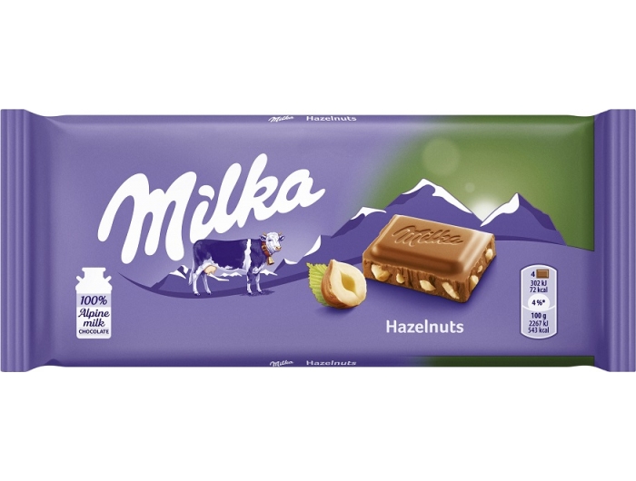Milk chocolate with Alpine milk with pieces of hazelnut.