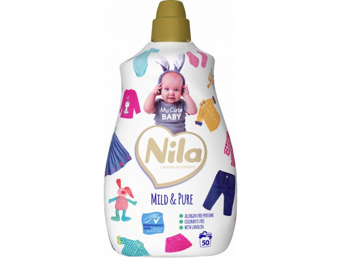 Nila mild & pure – liquid detergent for machine and hand washing of children's clothes and clothes of people with sensitive skin. Dermatologically tested. Without dyes. Allergen-free fragrance