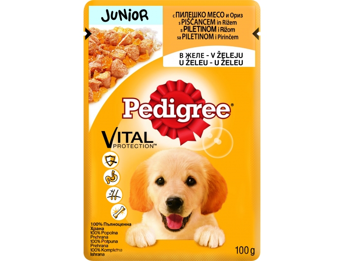 Pedigree bag junior with chicken and rice in jelly, complete food for puppies and growing dogs.