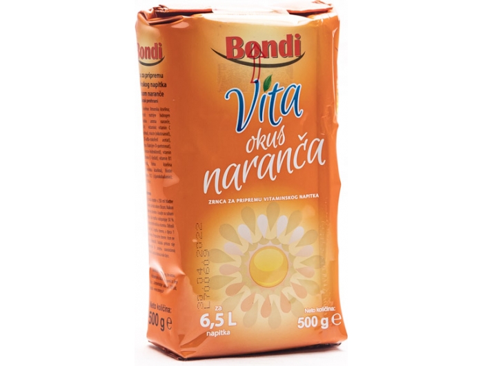 Zucchero, acidificante: acido citrico, correttore di acidità: carbonato acido di sodio; aroma naturale di arancia, addensante. E414; vitamine: vitamina C (acido L-assorbico), niacina (nicotinamide), vitamina E (D-alfa-tocoferil acetato), acido pantotenico (calcio D-pantotenato), vitamina B6 (piridossina cloridrato), vitamina B2 (riboflavina sodica-5 '-fosfato), vitamina B1 (tiamina mononitrato), acido folico (acido petroilmonoglutammico), biotina (D-biotina), vitamina B12 (cianocabalamina); coloranti: E 160a, E 160e.