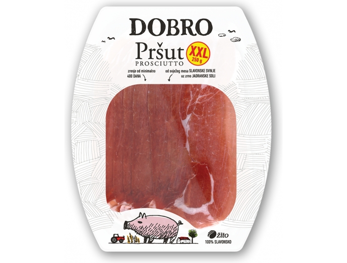 Produkt o rumianej barwie, charakterystycznym łagodnym i soczystym smaku oraz delikatnej i miękkiej strukturze. Prosciutto Dobro produkowane jest tylko z dwóch składników – udźca wieprzowego, który pochodzi wyłącznie ze świeżego wieprzowiny ze Słowenii oraz soli adriatyckiej, którą dodajemy w minimalnej ilości. Dzięki wysokim wartościom odżywczym jest lekkostrawny i polecany do spożycia przez każdego. Jej wyjątkowy smak wymaga tylko odrobiny soli morskiej i dużo czasu, dzięki czemu okres dojrzewania trwa co najmniej 400 dni.