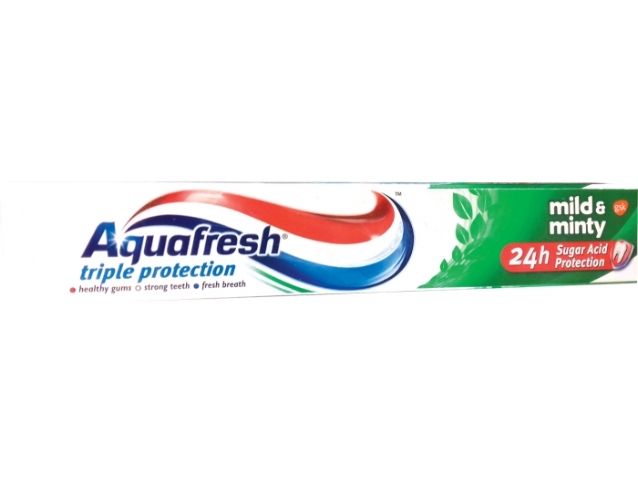Aquafresh Mild & Minty pasta za zube ima blagi okus mente i pruža trostruku 24-satnu zaštitu: snažne zube, zdrave desni i svjež dah. Zahvaljujući sastavu s fluoridom pomaže u zaštiti od glavnog uzročnika karijesa, šećerne kiseline u plaku. Sadrži blagi i osvježavajući okus mente koji dugotrajno osvježava i ostavlja osjećaj čistoće i svježine u ustima.