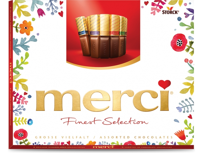 Merci 8 vrsta odabranih čokoladnih specijaliteta. Nugat, Mliječna čokolada, Badem-Mlijeko-Lješnjak, Pralina krema, Tamna mliječna čokolada, Marcipan, Kakaova krema, Kava-Vrhnje.