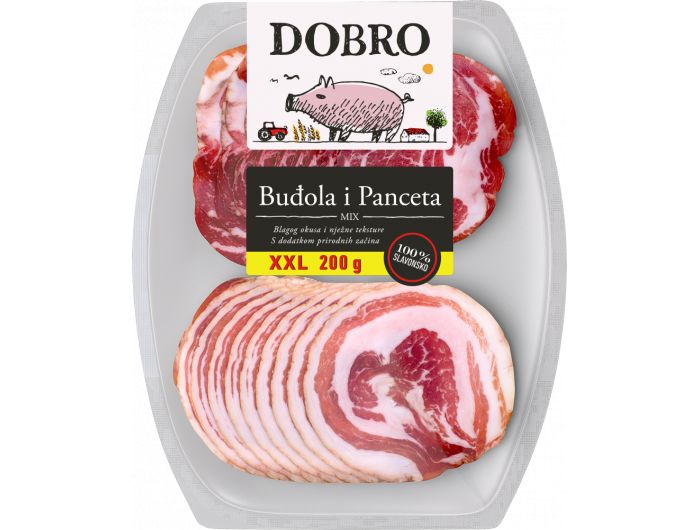 Mix buđola i rolana panceta naresci. Trajni suhomesnati proizvod. Blagog okusa i nježne teksture s dodatkom prirodnih začina. 100% slavonsko.