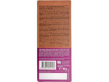 kakaova masa, dijetalna vlakna 28 % (dekstrin, inulin, oligofruktoza), kakaov maslac, sladilo: eritritol; kakaov prah smanjene masti, komadići sušene kupine 2 %, emulgator: SOJIN LECITIN; prirodna aroma vanilije, sladilo: steviol glikozidi, aroma