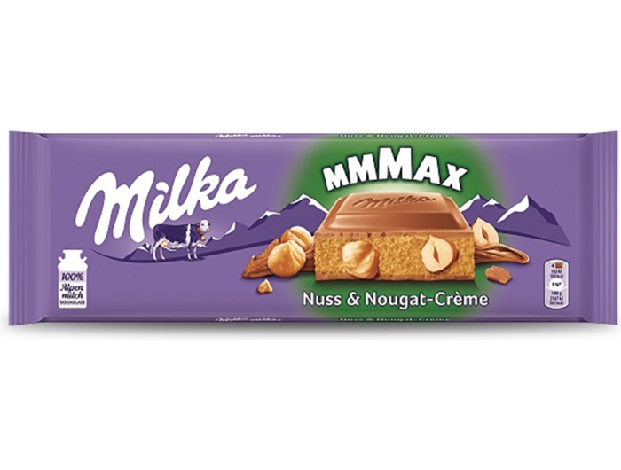 Mliječna čokolada s alpskim mlijekom s punjenjem od lješnjaka i badema (40%) i cijelim lješnjacima (8%).