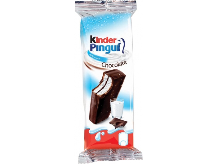 Biskvit s finom čokoladom, mliječnim punjenjem (48,5 %) i kakaovim punjenjem (12,5 %). Kinder Pingui svjež je i ukusan, čokoladom prekriven desert. Neodoljivo mliječno punjenje između dva tanka sloja biskvita s okusom kakaa prekriveno je ukusnom čokoladom. Okus koji će vaša djeca zasigurno voljeti!