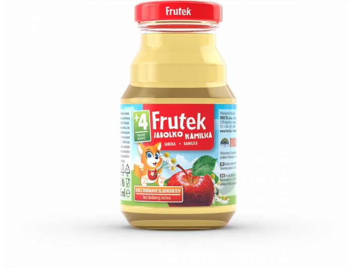 Frutek sok od jabuke i kamilice negazirano je i osvježavajuće piće od voćnog soka jabuke i biljnih ekstrakata kamilice i komorača. Bez dodanog je šećera jer sadrži prirodne šećere i prirodan je izvor vitamina C. Frutek sok od jabuke i kamilice namijenjen je bebama od 4 mjeseca starosti. Ne sadrži gluten. Udio voća je najmanje 50 %, a sadrži i ekstrakt komorača koji, osim što ugodno miriše, ima i mnoga ljekovita svojstva, posebno za osjetljivu probavu beba. Jabuka osvježava, a kamilica umiruje u ovoj ukusnoj Frutek kombinaciji.