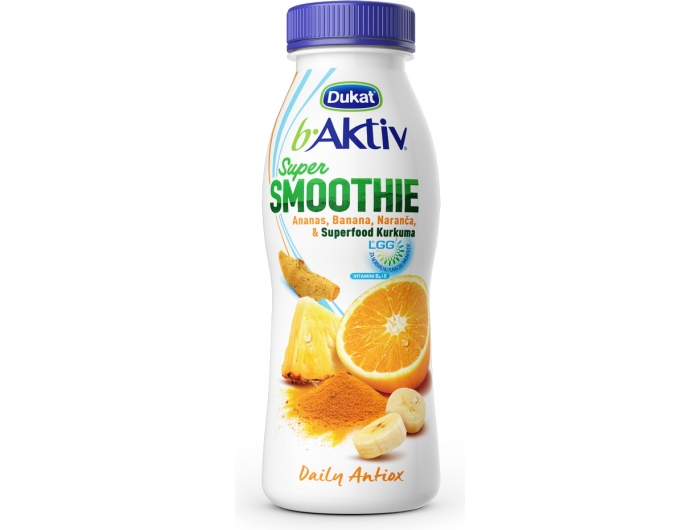 b.Aktiv LGG Super Smoothie s kurkumom spoj je najpopularnijeg funkcionalnog jogurta na tržištu, sočnih komadića ananasa, banane i naranče i kurkume.