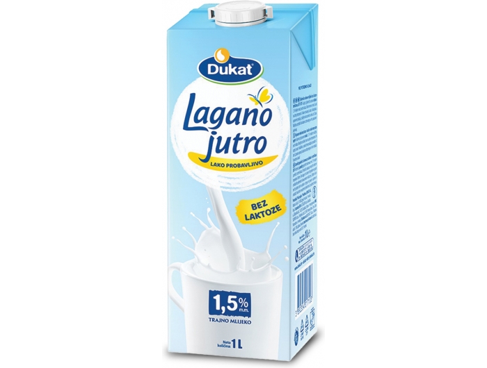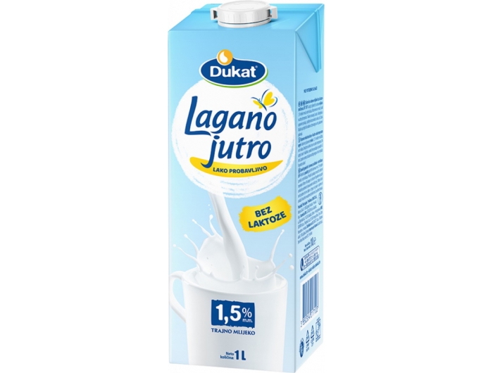 Dukat Lagano jutro mlijeko bez laktoze i s 1,5% mliječne masti lako je probavljivo i omogućuje uživanje u mlijeku osobama s intolerancijom i osjetljivošću na laktozu (mliječni šećer). Dukat Lagano jutro mlijeko blago je slatkastog okusa jer je laktoza razgrađena na jednostavnije šećere glukozu i galaktozu koji daju blago slatkast okus mlijeku, a koje osobe osjetljive na laktozu mogu lako probaviti.