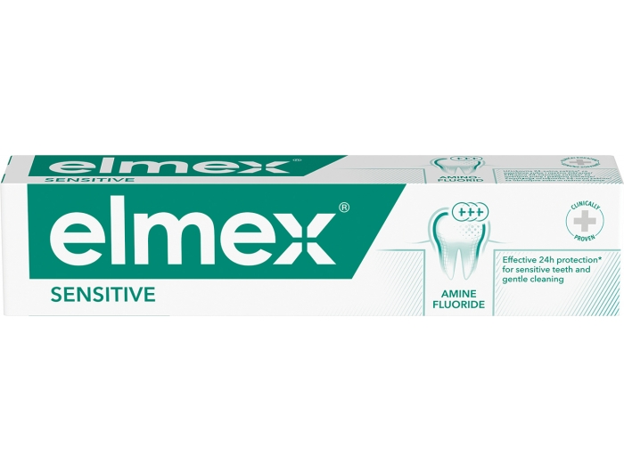 Elmex® Sensitive pasta za zube posebno je razvijena za njegu osjetljivih zuba i zaštitu izloženih zubnih vratova. Ključni sastojak aminfluorid formira zaštitni sloj na dentinu, odbija bolne podražaje i štiti izložene zubne vratove od karijesa. Elmex® Sensitive pasta za zube namijenjena je osobama s preosjetljivim zubima i izloženim zubnim vratovima, a nježno čisti zahvaljujući posebnom abrazivnom sredstvu kako ne bi oštetila mekani zubni vrat.