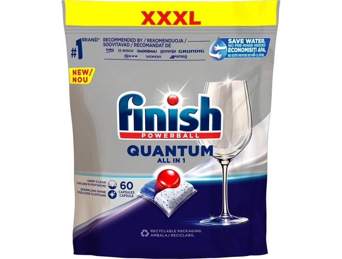 Finish Quantum Ultimate tablete za strojno pranje posuđa dolaze s poboljšanom učinkovitosti djelovanja, uz istovremeno smanjenje utjecaja na okoliš. Tri komore pokrivaju tri razine pranje. Powerball kuglica pruža savršen sjaj, gel brzo djeluje i uklanja najtvrdokornije mrlje, a prašak nudi učinkovito čišćenje. Također sadrži biorazgradivu foliju koja je 100 % topljiva u vodi. Nova formula sadrži manje kemikalija i prilagođena je potrebama potrošača. Kapsule Finish Quantum postižu nenadmašive rezultate u eko ciklusu koji pomažu uštedi vode te sadrži 19 % grama manje kemikalija po ciklusu pranja. Pakiranje se može reciklirati i višestruko upotrijebiti. Ručno pranje i prethodno ispiranje posuđa nije potrebno. Štedimo vodu!