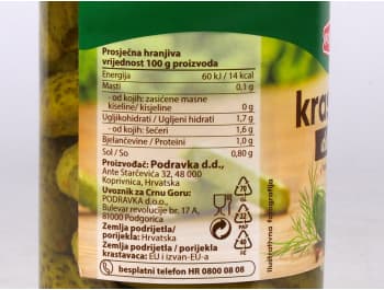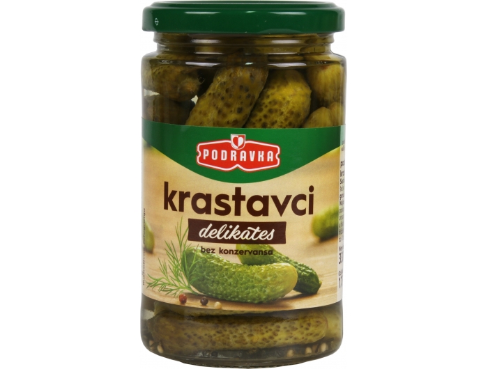 Samo birane sorte krastavaca koriste se za delikates pakiranje ove hrskave povrtnice koja je zbog svog osvježavajućeg okusa dobrodošao prilog raznim mesnim jelima, te nezaobilazan sastojak različitih vrsta salata. Konzumiranje krastavaca blagotvorno djeluje i na vaše tijelo jer su bogati raznim vitaminima, mineralima i antioksidansima. Bez konzervansa.