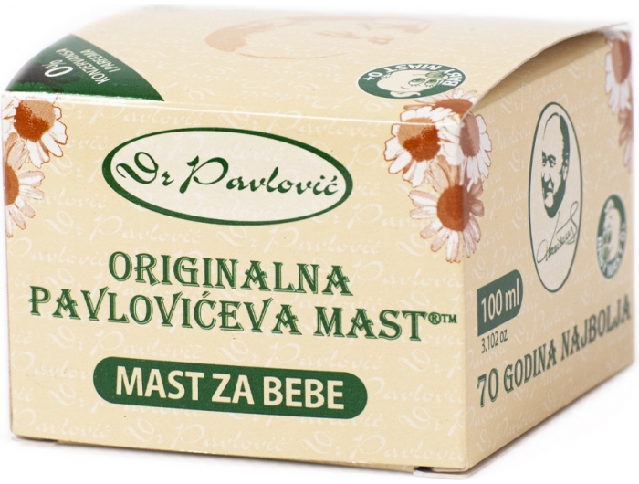 Originalna Pavlovićeva mast za bebe - za njegu i zaštitu kože beba (kao i djece). Mast sa bisabololom ima umirujuće i blago djelovanje na osjetljivu kožu beba. Usporava isušivanje kože i vlaži je iznutra.