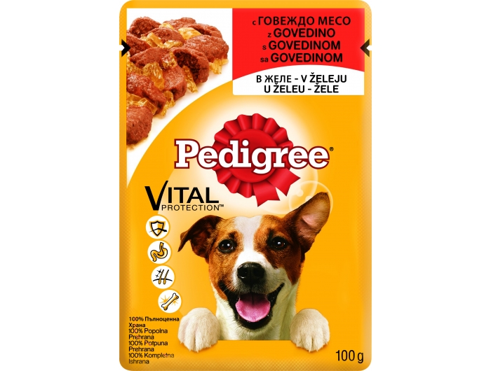 Meso i mesni proizvodi (39 %, uključujući 4 % govedine), minerali, biljni proizvodi (uključujući 0,5 % sušenog mesa cikle), ulja i masti (uključujući 0,5 % suncokretovog ulja), ekstrakti biljnjih bjelančevina. Analitički sastav: bjelančevine: 7, sadržaj masti: 6, anorganska tvar: 2, sirova vlakna: 0,3, voda: 82,5, kalcij: 0,35. Dodaci po kg: prehrambeni dodaci: vitamin d3: 150 i.j., vitamin e: 50 mg, kalcijev jodat anhidrat 0,39 mg, bakrov sulfat pentahidrat 5,7 mg, željezni sulfat monohidrat 10 mg, mangan sulfat monohidrat: 5,6 mg, cinkov sulfat monohidrat: 107 mg. Tehnološki dodaci: kasija guma 2100 mg.