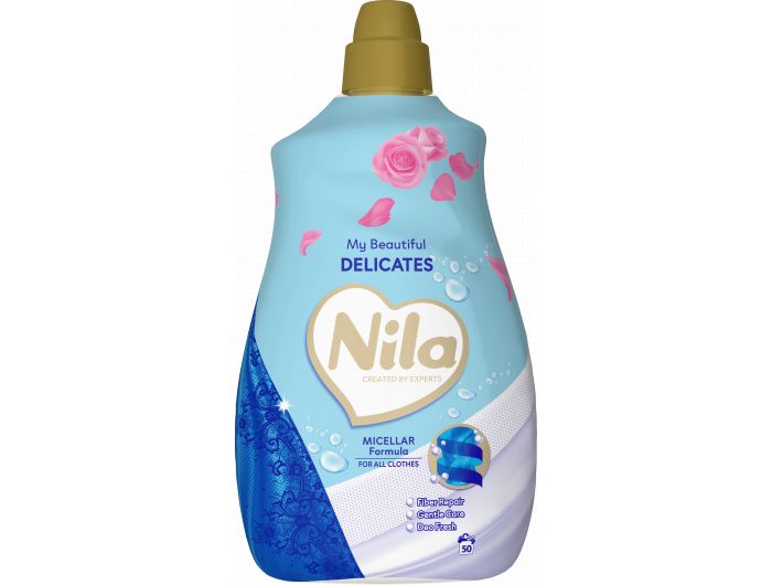 NILA MY BEAUTIFUL DELICATES s Micelarnom formulom zadovoljava sve zahtjeve za njegu iznimno osjetljivog rublja, jer sadrži enzime koji ne oštećuju osjetljiva vlakna poput vune i svile. Osigurava čistoću, uz pažljivu i blagu njegu različitih vrsta odjeće izrađene iz osjetljivih vlakana. Štiti i njeguje boje, čuva oblik i elastičnost odjevnih predmeta tako da će dugo ostati kao novi. Profinjen miris bez alergena osigurava ugodnu svježinu odjeće.