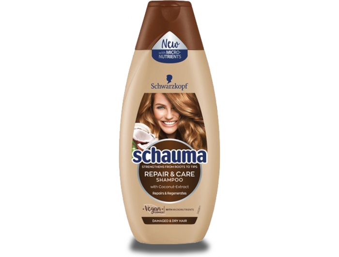 Imate li oštećenu ili suhu kosu? Schauma Repair & Care šampon s mikronutrijentima za oštećenu i suhu kosu. Schauma Repair & Care obnavljajuća formula s ekstraktom njegujućeg kokosa zaglađuje i hrani strukturu vlasi. Vegan formula. Dermatološki dokazana kompatibilnost s kožom.