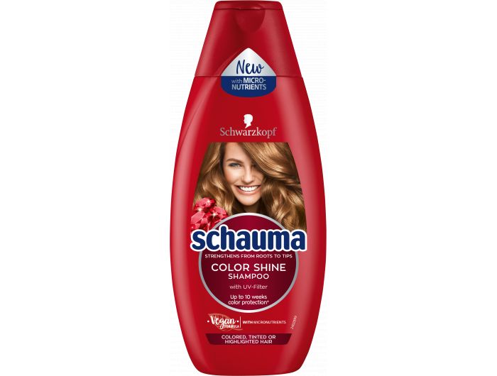 Schauma Color Shine šampon s mikronutrijentima za obojenu, posvijetljenu kosu ili kosu s pramenovima. Schauma Color Shine formula s UV filtrom pruža snažnu dugotrajnu zaštitu boje do 10 tjedana i daje kosi intenzivan sjaj. Dermatološki dokazana kompatibilnost s kožom.