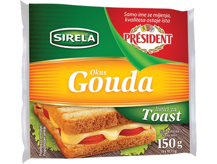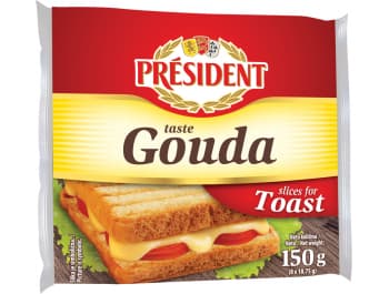 President topljeni sir u listićima, okus Gouda, važan je, ako ne i najvažniji, sastojak slasnih toplih sendviča, hamburgera, umaka i mnogih drugih toplih jela. Praktično pakiranje za brzo odmatanje svakog listića sira, puni okus Goude i savršena topivost čine ga prvim izborom ljubitelja topljenih sireva.