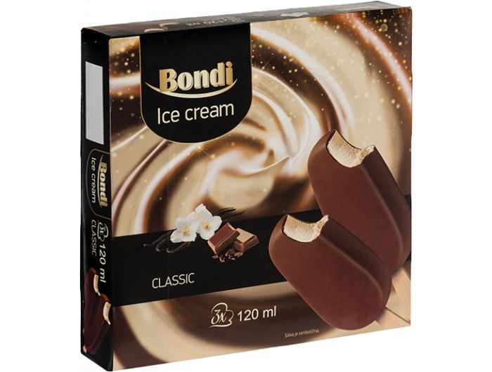 Sladoled okusa vanilije (72%), preliven mliječnom čokoladom (28%)