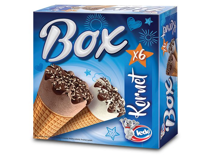 Sladoled okusa vanilije u vaflu 19,5% s kakaovim preljevom 10% i posipom od čokolade i bijele čokolade 1,7% i sladoled okusa čokolade u vaflu 19,5% s kakaovim preljevom 10% i posipom od čokolade i bijele čokolade.
