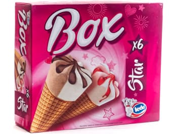 SLADOLED OKUSA VANILIJE I SLADOLED OKUSA ČOKOLADE U VAFLU S KAKAOVIM PRELJEVOM: voda, vafel 18 % (PŠENIČNO brašno, šećer, kokosova mast,emulgator SOJIN lecitin, modificirani PŠENIČNI škrob, kuhinjska sol, tvar za rahljenje E500), kakaov preljev 13 % (kokosovo ulje, šećer, kakaov prah smanjene masti 10 %, emulgatori (E442, E476), aroma), šećer, obrano MLIJEKO u prahu, kokosovo ulje, glukozni sirup,kakaov prah smanjene masti 1 %, SIRUTKA u prahu, emulgator E471, stabilizatori (E410, E412, E407), aroma. SLADOLED OKUSA VANILIJE I SLADOLED OKUSA OD JAGODE U VAFLU S PRELJEVOM OD JAGODE: voda, vafel 17,7 % (PŠENIČNO brašno, šećer, kokosova mast,emulgator SOJIN lecitin, modificirani PŠENIČNI škrob, kuhinjska sol, tvar za rahljenje E500), kakaov preljev 8,5 % (kokosovo ulje, šećer, kakaov prah smanjene masti 10 %, emulgatori (E442, E476), aroma), šećer, preljev od jagode 6,6 % (šećer, kaša jagode 35 %, glukozni sirup, voda, kiselina E330, želatina, stabilizatori (E440, E410, E412, E466), MLIJEČNI proteini), obrano MLIJEKO u prahu, kokosovo ulje, glukozni sirup, jagoda kaša 1,7 %, SIRUTKA u prahu, emulgator E471, stabilizatori (E410, E412, E407), bojilo E162, arome.