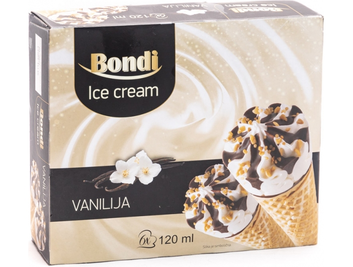 Sladoled okusa vanilije 71,1 % (rekonstruirano obrano MLIJEKO, glukozno-fruktozni sirup, šećer, kokosovo ulje, SIRUTKA u prahu, emulgator; mono-i digliceridi masnih kiselina, stabilizatori; brašno sjemenke rogača, guar guma, aroma, obrano MLIJEKO u prahu, bojilo; E160a,), kornet od vafla 17,5 % (PŠENIČNO brašno, šećer, emulgator; SOJIN lecitin, kokosovo ulje, sol, karamel (šećer, voda)), kakaov preljev 10,3 % (kokosovo ulje, šećer, kakaov prah smanjene masti 7 %, emulgator; lecitin iz suncokreta, karamelizirani LJEŠNJAK 1,1 % (šećer, LJEŠNJAK).
