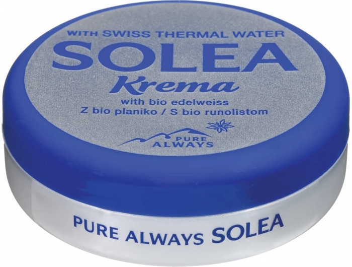 Solea univerzalna krema primjerena je za suhu i osjetljivu kožu. Krema je formulirana s termalnom vodom iz švicarskih Alpa i organskom planikom.